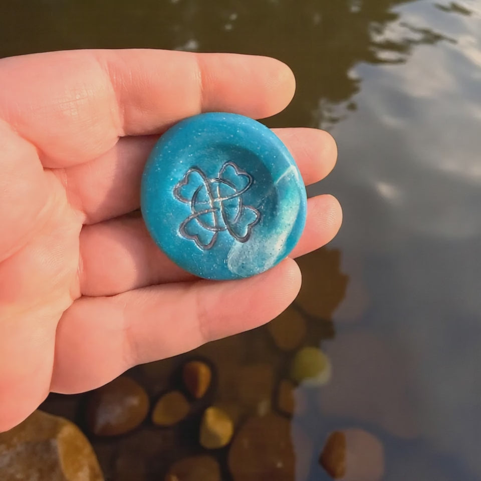 Its smooth surface is perfect for holding in your palm, allowing for a soothing tactile experience. A design on the stone's face allows for additional tactile soothing effect. Each stone is unique, highlighting the craftsmanship involved in its creation.